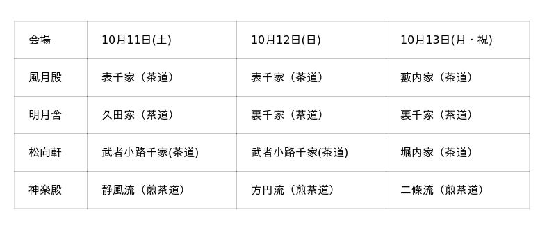 茶道4家元2宗匠と煎茶道3流派が集結し、北野天満宮境内の茶室等を会場として、日替わりで茶会を開催