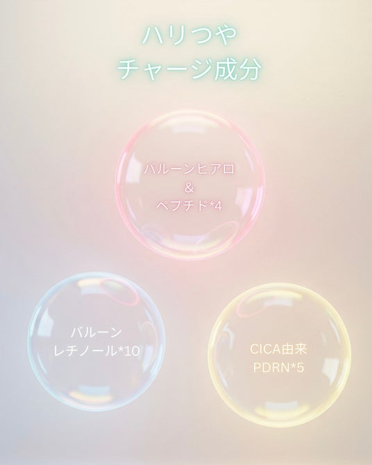 従来比2倍*3のバルーンヒアロ&ペプチド*4に加え、トレンド成分・CICA由来のPDRN*5を新たに配合。