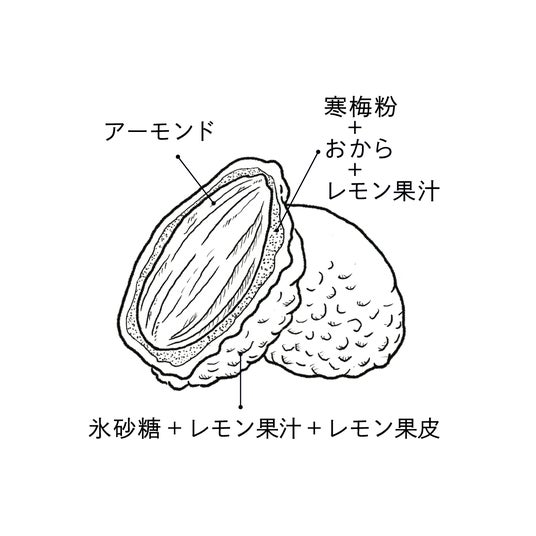 おからパウダーと寒梅粉(もち米の粉)、レモン果汁の生地でアーモンドを包み、カリカリに煎ったのちに、氷砂糖、レモン果皮、果汁で味付けされた豆菓子は、たまらない食感と無添加の優しい味