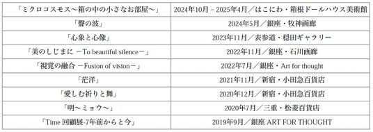 東京都内を中心に国内での個展、グループ展などをはじめ、フランス・パリでの企画展に出展。
