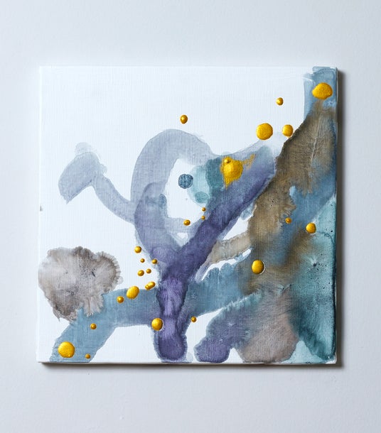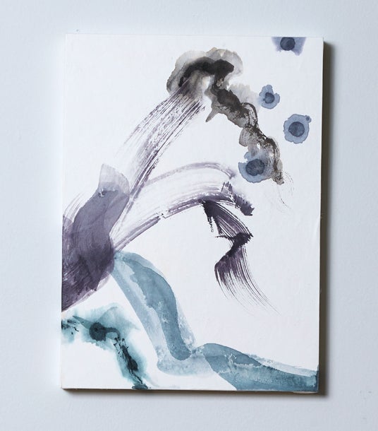 日本で唯一、伝統的工芸品に指定されている「鈴鹿墨」の色墨をメインのメディアとした抽象作品が並ぶ。yuragiが表現するものとは?