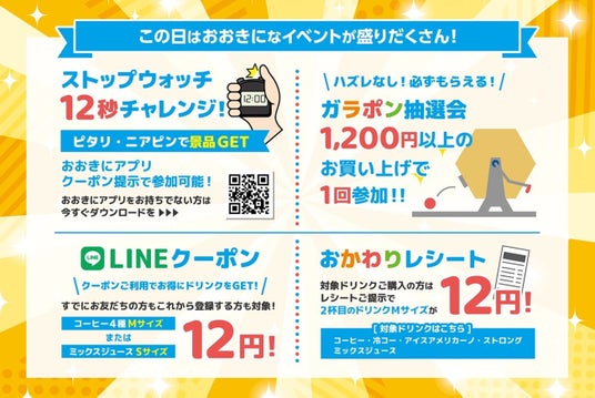 おおきにアプリにて配信されたクーポン(挑戦券)を提示でチャレンジできる体感ゲーム。 ストップウォッチを「12秒ピッタリ」で止められた方には豪華景品をプレゼント! 惜しくもニアピンの方にも景品をご用意しております。