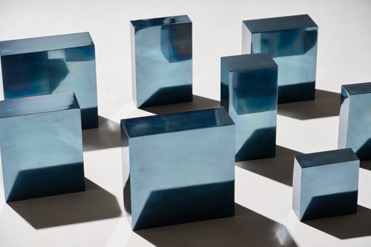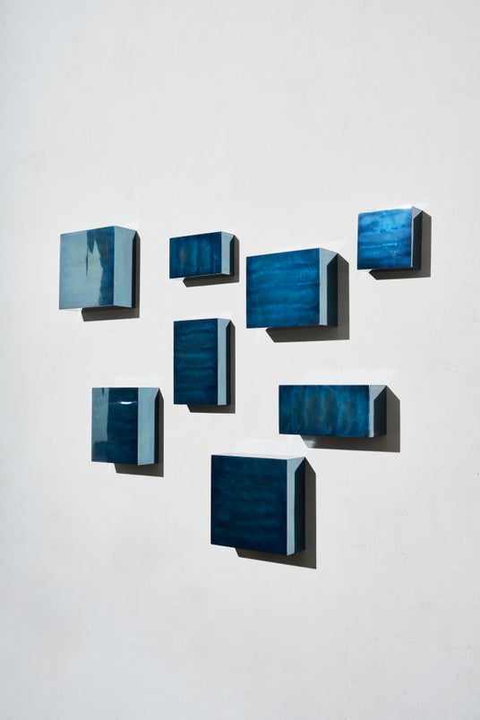 その作品は、勝木自身の手によって深い青色に輝きます。