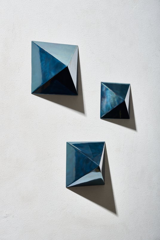 本展示では、近代的な建築を真上から俯瞰するような風景をイメージした『エッジのきいた形』をコンセプトにして制作された作品が並びます。人工的な形の中に写り込んだ海や空といった自然物が、勝木氏の独自な表現技法によって融和し、唯一無二の造形物として美しく輝きます。