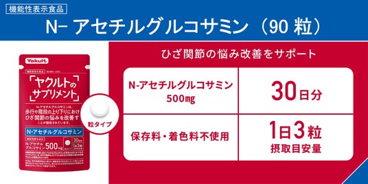 本品はひざ関節の悩みを改善することが報告されているN-アセチルグルコサミンを500mg配合した、「ヤクルトのサプリメント」ブランド初の機能性表示食品です。歩行や階段の上り下りの際、ひざに悩みを感じられている方におすすめの商品です。