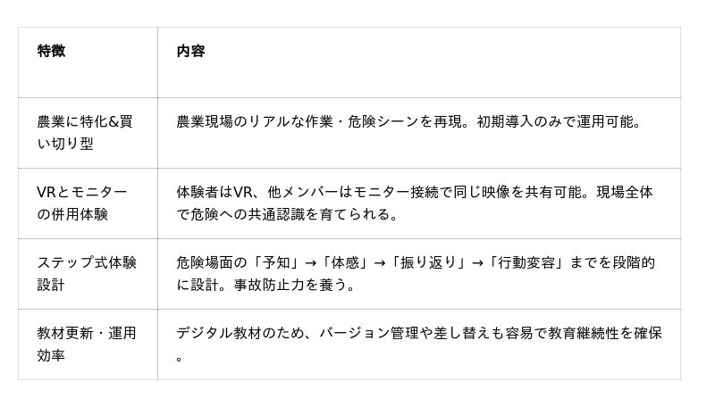 こうした背景から、農業の現場でも「再現性」「没入感」「効率性」を兼ね備えた新しい教育手段が求められています。