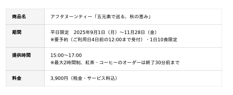 記念すべき初登場となる9~11月のアフタヌーンティーは「五元素で巡る、秋の恵み」をテーマに、「空」「風」「地」「水」「火」の一皿一皿が秋の情景を視覚や味覚に語りかけます。