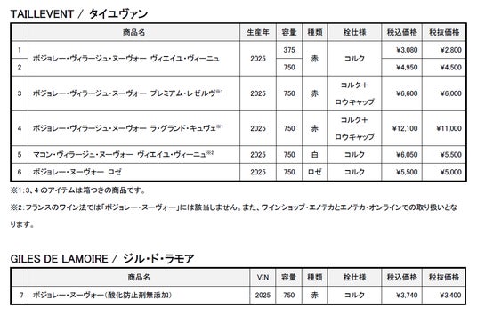 エノテカ株式会社(本社:東京都港区、社長:堀 慎二)は2025年産のフランスの新酒・ボジョレー・ヌーヴォーを11月20日から発売します。本年も「タイユヴァン」と「ジル・ド・ラモア」のボジョレー・ヌーヴォー計7アイテムを取りそろえます。発売に先立ち、エノテカ・オンラインとワインショップ・エノテカでは9月1日から10月31日までの期間中、通常価格より10%オフで購入できる先行予約を実施します。