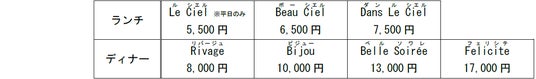 販売価格 各コースはランチ3種類、ディナー4種類をご用意しております。