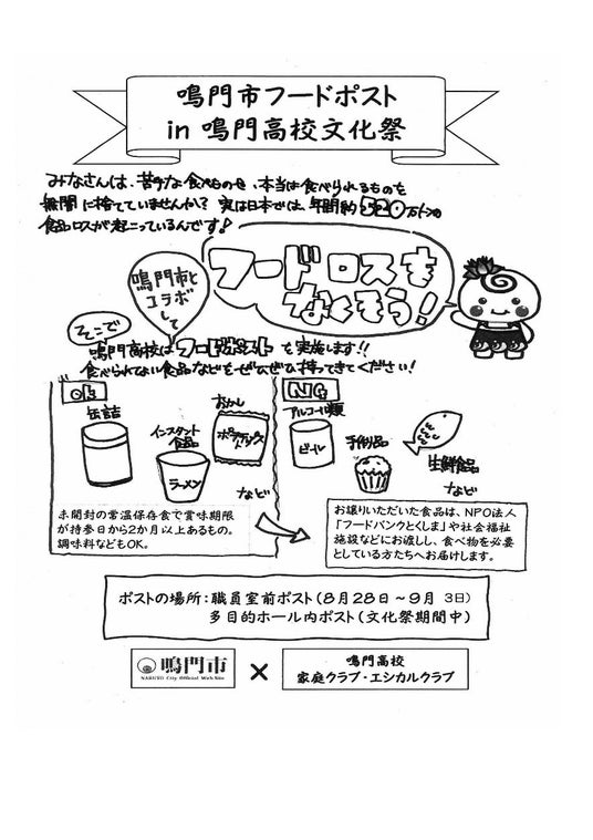ポスト設置期間中の9月2日(火)には鳴門高校文化祭前日祭、3日(水)には本祭が開催され、同校家庭クラブ・エシカルクラブの作品展示に合わせてフードポストが設置されます。