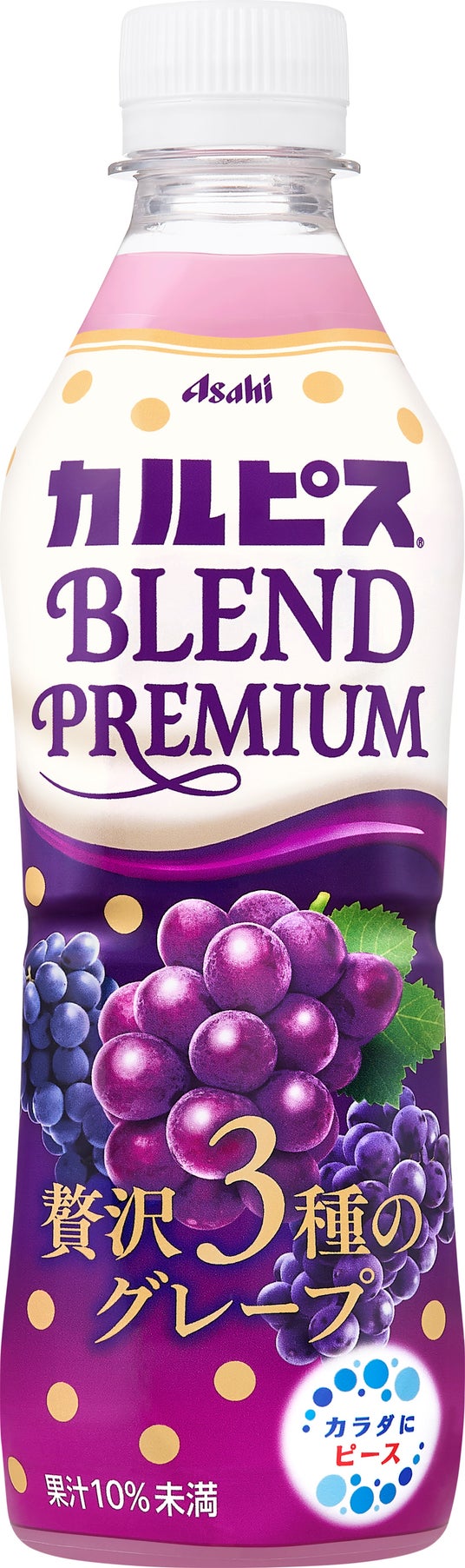パッケージは、中央に“BLEND PREMIUM”の文字を配し、3種類のブドウのイラストをデザインすることで、「カルピス」を濃いめに仕立てた味わいと、複数の果実のブレンドによる濃厚さを楽しめることを表現しています。