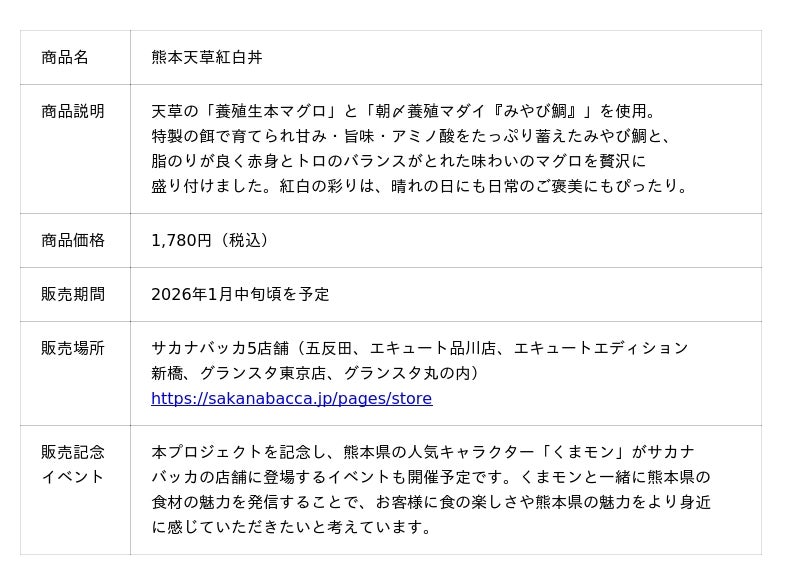 「生鮮流通に新しい循環を」をビジョンに掲げる株式会社フーディソン(本社:東京都中央区、代表取締役CEO山本徹、証券コード:7114、以下 当社)は、熊本県(知事 木村敬)、株式会社海苔弁山登り(本社:東京都中央区、代表取締役我妻義一、以下海苔弁山登り)と協業し、熊本県の食の魅力を発信する取り組みを推進してまいります。この取り組みの一環として、当社運営の鮮魚専門店sakana bacca(以下 サカナバッカ)5店舗にて、熊本県産の水産品を使った期間限定のオリジナル丼を販売します。これにより、首都圏のみなさまに熊本県の食の魅力を知っていただき、熊本県の地域活性化を応援してまいります。