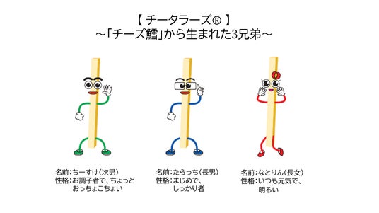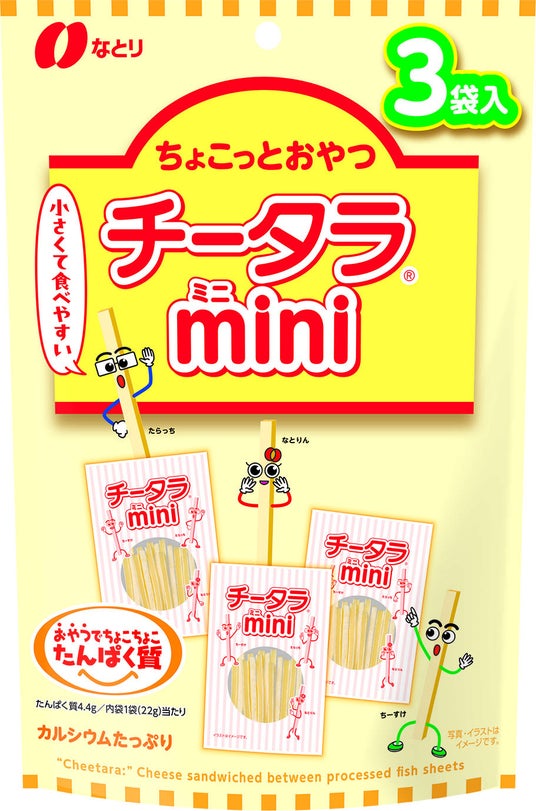 パッケージもおやつ向けに明るく楽しいイメージにし、当社オリジナルキャラクター「 チータラーズ(R)」が登場しています。