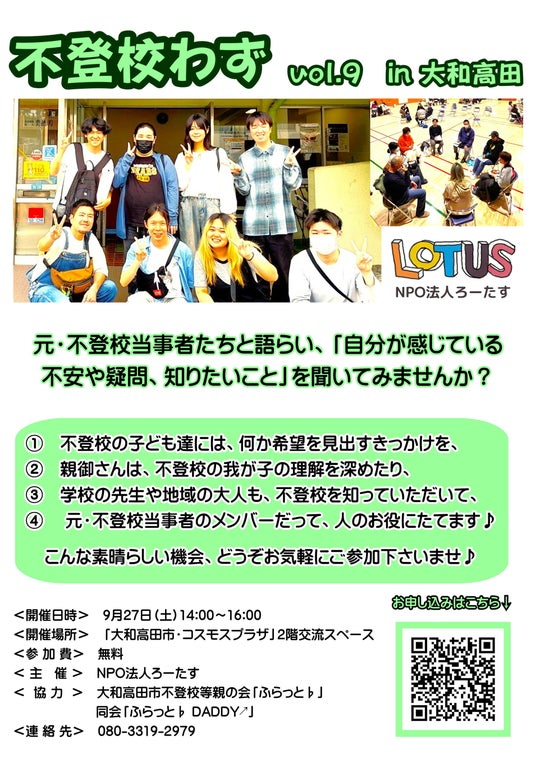 NPO法人ろーたす(大阪市)は、不登校の子どもと保護者を応援するイベント「不登校わずVOL.9」を、奈良県大和高田市で初開催します。不登校経験者の卒業生が「自分を認めて前進した物語」を語り、保護者や支援者に希望と実践的な知見を提供します。これまで大阪、豊中、吹田で8回開催、約200人以上が参加し、参加者の9割が「とても満足」と回答。「不登校でもなんとかなる!」の声が共感を呼んでいます。