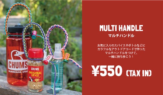 会場内CHUMSブースでは、現在販売中の「MONKEY MAGIC × CHUMS」BAGラインナップの展示・販売を実施。また実際にコラボ商品のキーデザインにもなっているパラコードを使用した「MULTI HANDLE」ワークショップを開催します。参加費は1回550円(税込)でボトルは持ち込み可、また当日ブースでの購入も可能です。(商品は別売り)