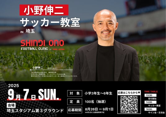 株式会社テレビ埼玉(本社:埼玉県さいたま市)と株式会社payforward(本社:東京都港区、代表:三宅亮輔)は、2025年9月7日(日)、元サッカー日本代表・小野伸二氏による小学生向けのサッカー教室を、埼玉スタジアム第3グラウンドにて共催いたします。