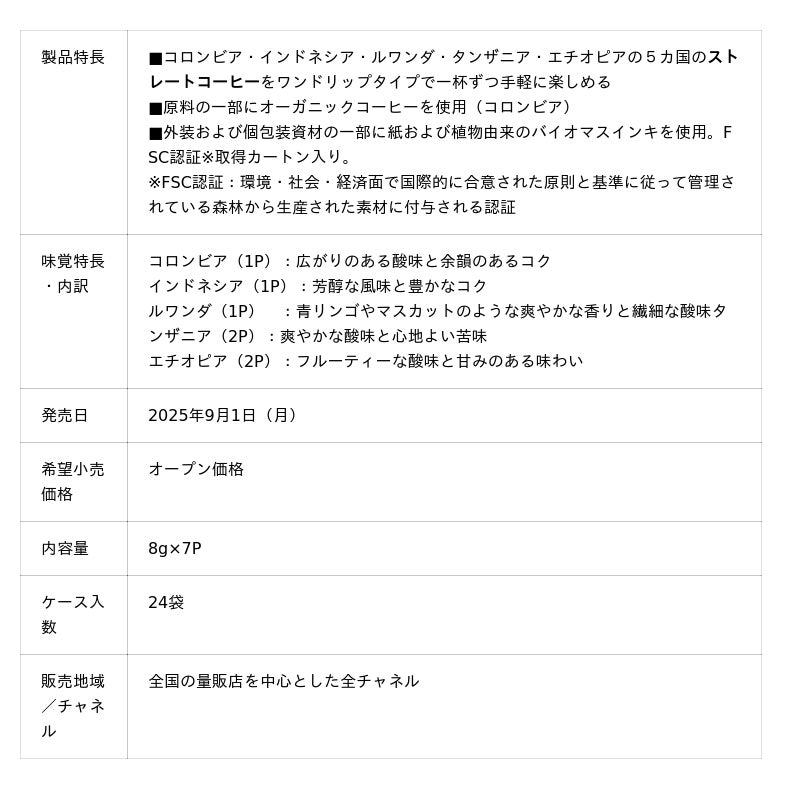 本製品は、愛好家の多いエチオピア(モカ)やタンザニア(キリマンジァロ)をはじめとしたユニークなコーヒーフレーバーを持つ産地をセレクトし、手軽に楽しめるワンドリップタイプにしてアソートしました。気分に合わせてお選びいただけるほか、「産地ごとの味わいの違いを試してみたいけれど、好みに合わなかったときに飲みきれるか心配」という方にもトライしやすい製品となっています。本製品を通じて、産地ごとのおいしさを再発見し、新たな好みとの出会いをお楽しみください。
