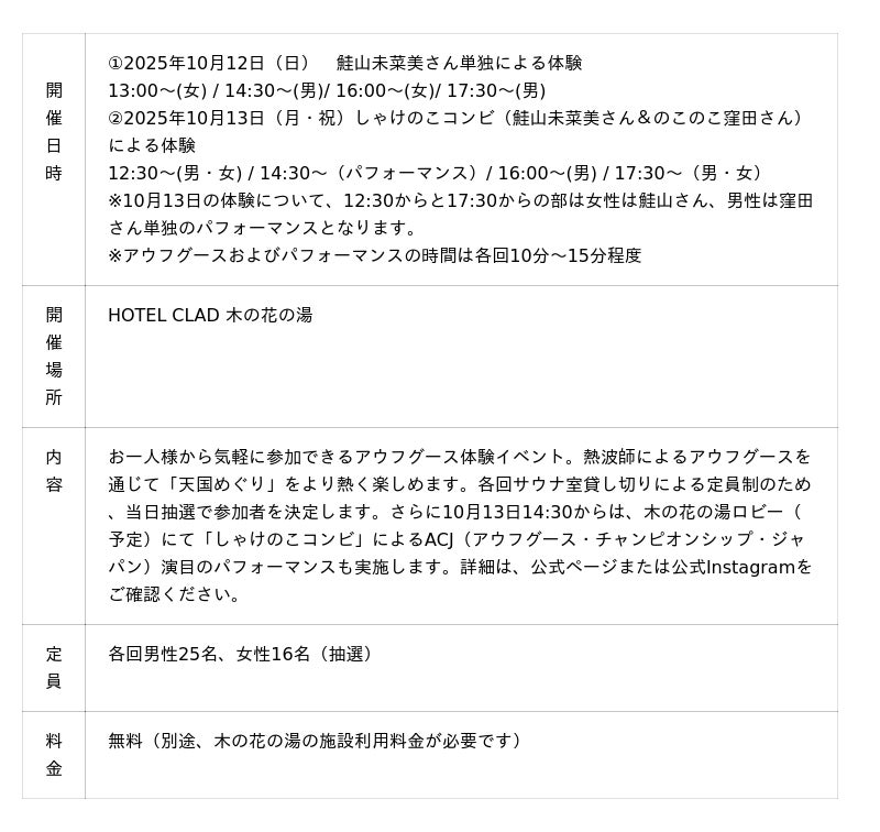 日本一予約が取れない熱波師 鮭山未菜美さんによるアウフグース体験やACJ(アウフグース・チャンピオンシップ・ジャパン)で優勝した「しゃけのこコンビ」(鮭山さん&のこのこ窪田さん)によるアウフグース体験を2日間にわたって開催。日本一のパフォーマンスから繰り出される熱波は一験(一見)の価値アリです。