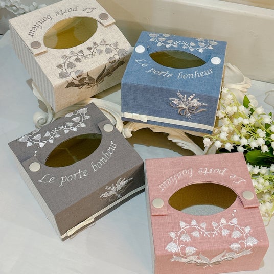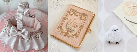 刺繍生地で仕立てる愛らしくフェミニンなカルトナージュブランド。完成品のほか、キットや素材もご紹介。