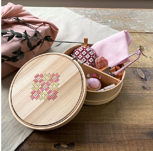 蓋にクロスステッチを施した、曲げわっぱの道具箱。お裁縫に必要な道具が一式入った、大人の上質な裁縫道具セット。