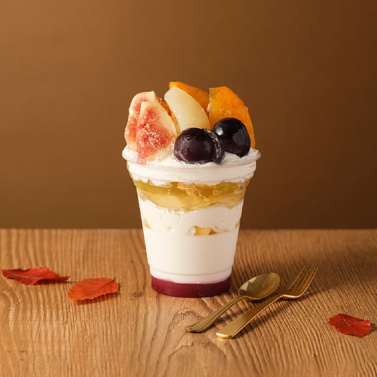 パンナコッタと葡萄ゼリーを柿、無花果、巨峰、洋梨で飾った秋満載のパフェ。東京ギフトパレット限定でお届けします。