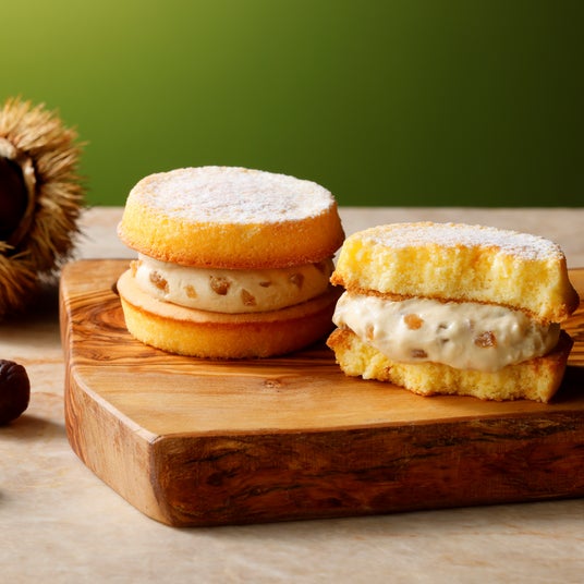 北海道生乳100%使用のマスカルポーネを使用したコクのあるなめらかなクリームにマロングラッセを加え、クリームチーズを練り込んだしっとり生地でサンドしました。