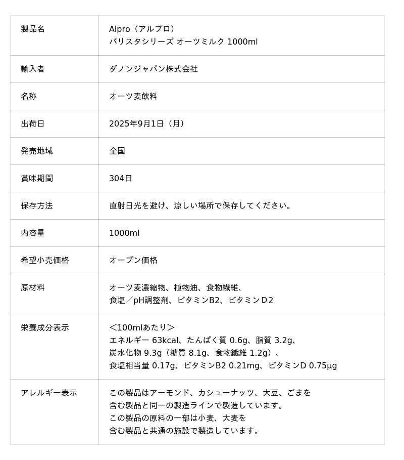 ダノンジャパン株式会社(本社:東京都目黒区、代表取締役社長:ロドリゴ・リマ、以下ダノンジャパン)は、カフェやレストラン向けに展開している業務用のオーツミルク「Alpro(アルプロ) バリスタシリーズ オーツミルク 1000ml」を、全国のスーパーマーケット向けに、2025年9月1日より出荷を開始します。