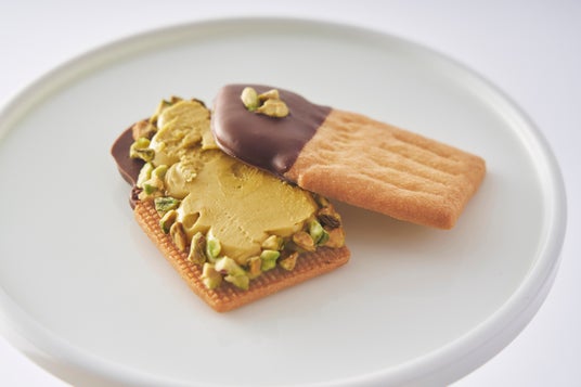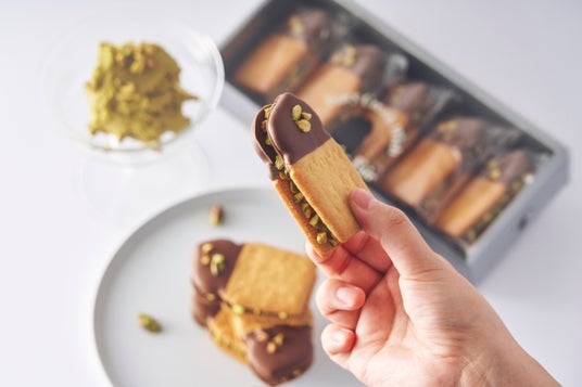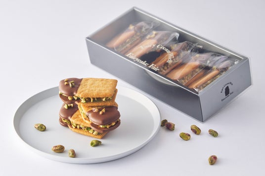 イタリア産ピスタチオペーストを贅沢に使った生バタークリームを、香ばしく焼き上げたビスケットでサンド。表面にはミルクチョコをかけ、砕いたピスタチオナッツをトッピング。まろやかな風味とサクッとした食感が織りなす、ピスタチオ尽くしの贅沢スイーツです。