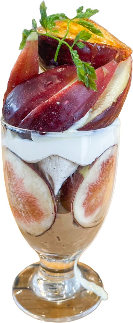 ■いちじくを楽しみつくす「いちじくパフェ」いちじく2玉使用のパフェはラテゼリーにいちじくジャム、メレンゲクッキーまで自家製のこだわりパフェ!