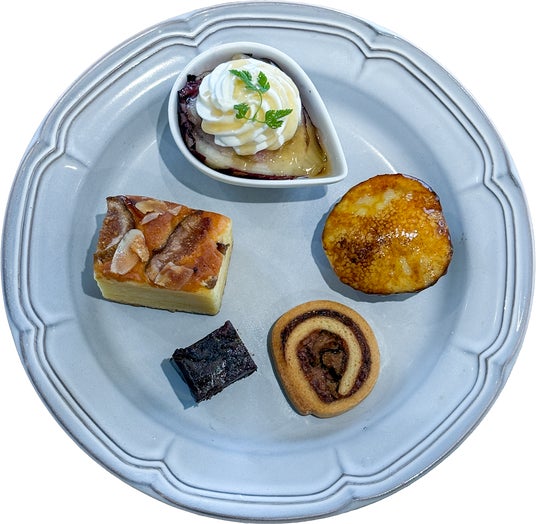 中段:いちじくのバターケーキ、テリーヌショコラ(いちじく赤ワイン煮使用)、ドライいちじくとあんこの焼き菓子、いちじくのクリームブリュレ、いちじくソルベ生クリームトッピング