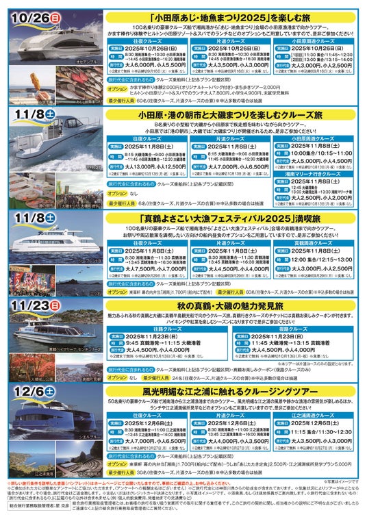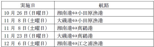 湘南港と葉山マリーナや大磯港等を結んでいる海上交通「かながわシーライド」を大磯以西に広げていくため、小田原漁港や江之浦漁港、真鶴港を活用した実証実験として、モニタークルージングツアー(第2弾)を10月から12月に実施しますので、お知らせします。