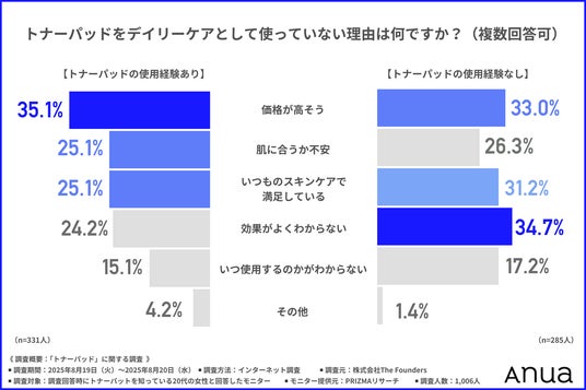 「トナーパッドをデイリーケアとして取り入れていない理由」について尋ねたところ、トナーパッドの使用経験の有無によって下記のような結果になりました