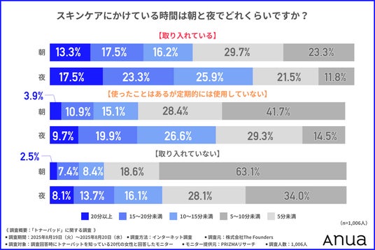 そこで、「朝と夜のスキンケアにかけている時間」についてトナーパッドの取り入れ状況ごとに尋ねたところ下記の結果となりました。