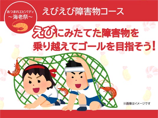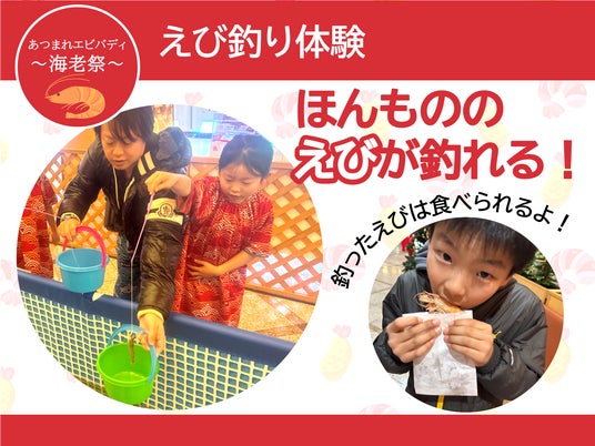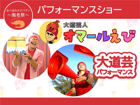 また、「大道芸人オマールえび」による「ジャグリング」などのパフォーマンスをはじめとするステージイベントや「くるまえびを釣って素揚げが食べられる」体験型イベント、手形・足形で海老のアートを作る「ワークショップ」などで“海老祭”を盛りあげます。