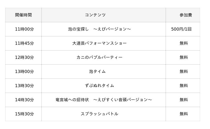 (1)泡の宝探し~えびバージョン~大人気の「泡の宝探し」を「海老の日バージョン」で行う1日限定のイベントです。
