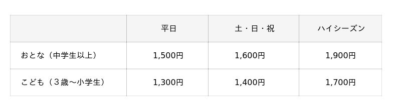 ■営業時間 10時00分~17時00分(最終受付 16時00分)■料金(1名/1日) ※再入場可