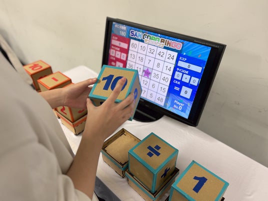 神奈川工科大学が開発したサイコロ型コントローラーを使ったビンゴゲームです。3つのサイコロを組み合わせて、ビンゴシートの各マスの数字が答えとなる計算式をつくり、対戦相手より早くビンゴを目指します。
