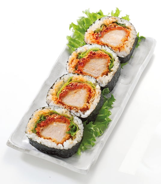 サクサクのひれかつを、甘辛なヤンニョムソースとシャキシャキのキャベツで巻きあげた、具材がたっぷり入った巻き寿司です。
