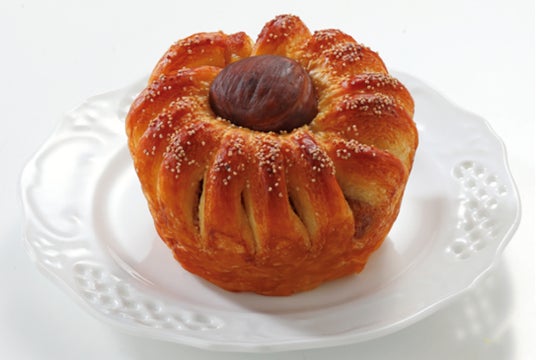 クルミ入りのマロンクリームをデニッシュ生地で包み、渋皮栗の甘露煮をのせ焼きあげました。表面にまぶしたポピーシード(ケシの実)のプチプチとした食感が味わいにさりげない変化を加えます。秋のティータイムにオススメの一品です。