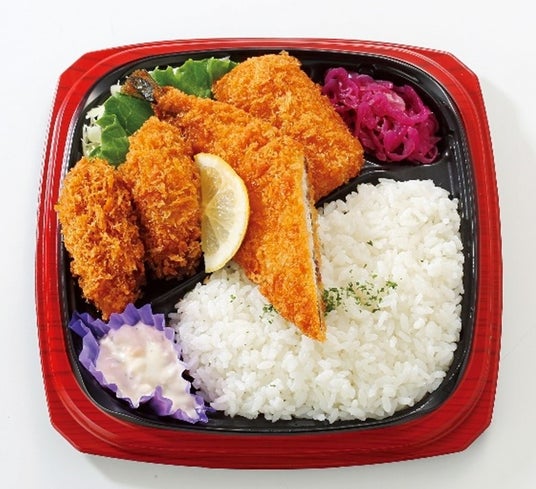 3種類の魚介フライが入ったお弁当です。旨味が凝縮された広島県産かきフライ、脂乗りの良いさんまフライと、かに入りのクリームコロッケを贅沢にお楽しみいただける一品です。