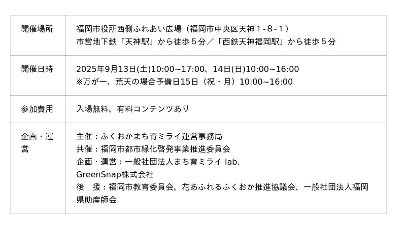 一般社団法人 まち育ミライlab. (本社:福岡市博多区 代表理事:水田ともこ)と、GreenSnap株式会社(本社:東京都中央区 代表取締役:西田貴一)は、主催:ふくおかまち育ミライ運営事務局のもと、【ふくおかまち育ミライ×GreenSnap Marche ~花とみどりとみんなのまち育て~】を2025年9月13日(土)、14日(日)に福岡市役所西側ふれあい広場にて開催します。