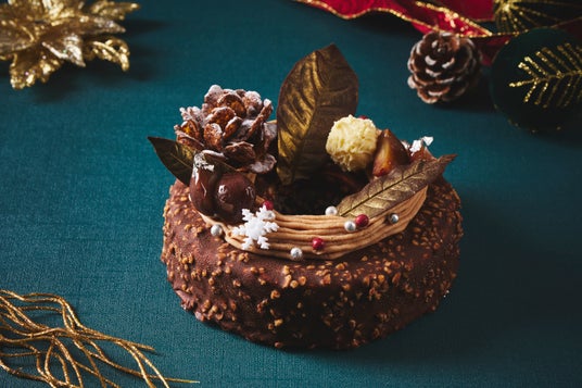 フランス産の濃厚なマロンペイストに、渋皮栗をアクセントとして加えたマロンムース。芳醇な香りが広がるコーヒーのクレームブリュレ、なめらかなカスタードクリーム、自家製のサクサクパイとスポンジを重ねた、5層仕立ての贅沢なケーキです。トップには、ヴァローナ社のこだわりのチョコレート“グアナラ”とアーモンドミゼットを合わせ、心地よいパリッとした食感をプラス。さらに、マロンクリームを絞りクリスピーチョコで松ぼっくりを模したデコレーションを施し、クリスマスリースを思わせる華やかな佇まいに仕上げました。それぞれの素材が奏でる濃厚で奥深い味わいのハーモニーをご堪能ください。