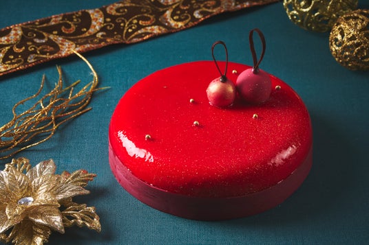 ラズベリーといちごのムースに、フレッシュオレンジの果肉とピールを加えたオレンジムースを重ね、県産黒糖にシナモンとカルダモンを効かせたクリームで、豊かな風味に仕上げました。酸味のあるグリオットチェリーとフランボワーズのジュレ、ザクザクとしたカカオニブが食感と味のアクセントに。さらに、発酵バターを贅沢に使ったフランス伝統菓子“ガレット・ブルトンヌ”を忍ばせ、ひと口ごとに広がる多彩なハーモニーをお楽しみいただけます。艶やかな真っ赤なグラサージュが、聖夜のテーブルを華やかに彩ります。