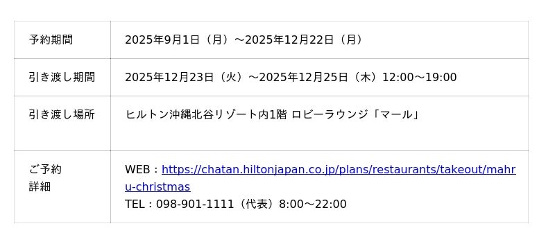 【2025年8月28日】ヒルトン沖縄北谷リゾート(北谷町(ちゃたんちょう)美浜(みはま)、統括総支配人 宍倉裕(ししくらゆたか))は、3階ロビーラウンジ「マール」にて、2025年9月1日(月)よりクリスマスケーキの予約受付を開始いたします。