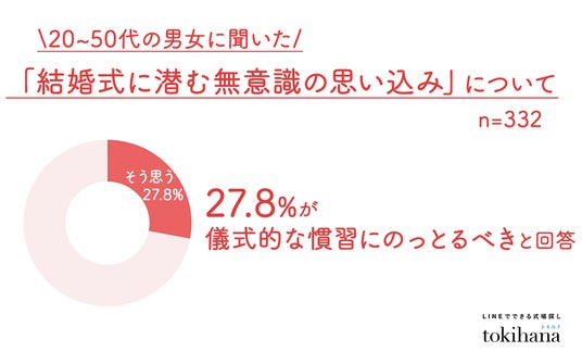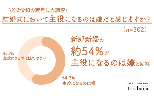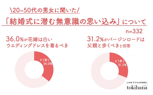 LINEでできる式場探し『トキハナ(https://tokihana.net/)』を運営する株式会社トキハナ(本社:東京都港区、代表取締役社長:安藤 正樹、以下 「トキハナ」)は、価値観の多様化により「目立ちたくない」「主役感が苦手」と感じる若者が増える中で、結婚式に潜む無意識の思い込みに焦点を当てた意識調査を20代~50代の332人に向けて実施しました。