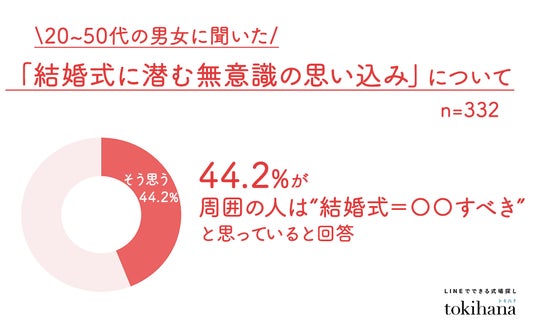 「自分はそう思っていないが、周囲の人は上記に挙げられたような“結婚式=〇〇すべき”という価値観を持っていると思う」と回答した人は44.2%にのぼりました。