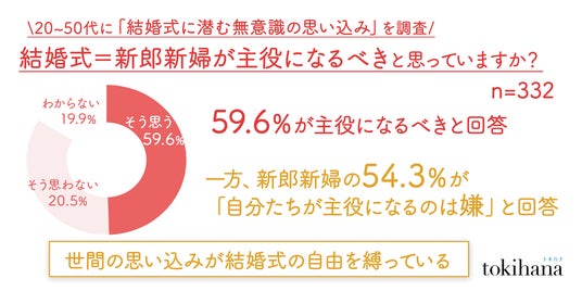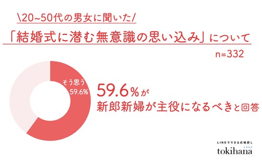 結婚式に潜む無意識の思い込みについて調査したところ「結婚式=新郎新婦が主役になるべき」と考える人は59.6%と過半数を超えました。