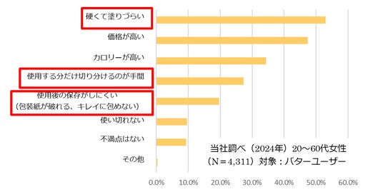 パンにバターを塗って食べるのは定番ですが、実は半数以上の方が「硬くて塗りにくい」と感じています。また、「切り分けるのが手間」「保存しにくい」といった使い勝手に関する不満も少なくありません。