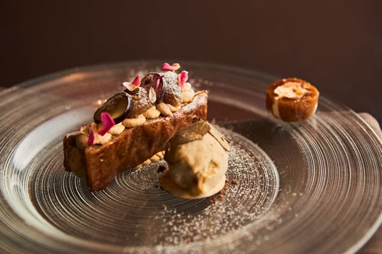 メインには、炭の香りをまとった和牛「葉山クイーンビーフ」を。ビーツのクーリーと赤酒のレディクションが、その旨みを引き立てます。お食事の締めくくりには、和紅茶と柑橘、マロングラッセのガトーに、トリュフ香るアイスクリーム、干し柿と杏のミニャルディーズと共にお楽しみいただけます。
