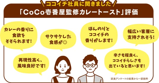 完成した『CoCo壱番屋監修カレートースト』をココイチ社員の方々に試食調査を実施した結果、「カレーの香りが食欲をそそる」「サクサクした食感が◎」「再現性高く、風味良好」といった、風味・食感・再現性の観点からご好評をいただきました。